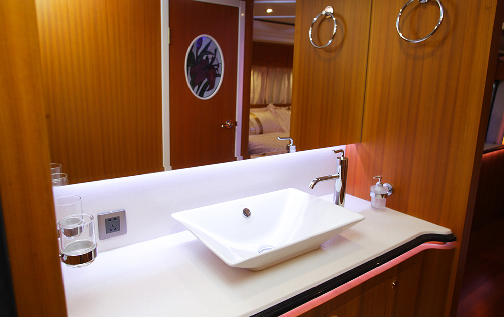 獨(dú)立干濕分離式衛(wèi)生間銀質(zhì)水龍金質(zhì)水盆高貴而實(shí)用整體鋼化玻璃淋浴房底部大排水網(wǎng)孔外置超寬洗漱大理石臺(tái)面臺(tái)上優(yōu)瓷臺(tái)盆