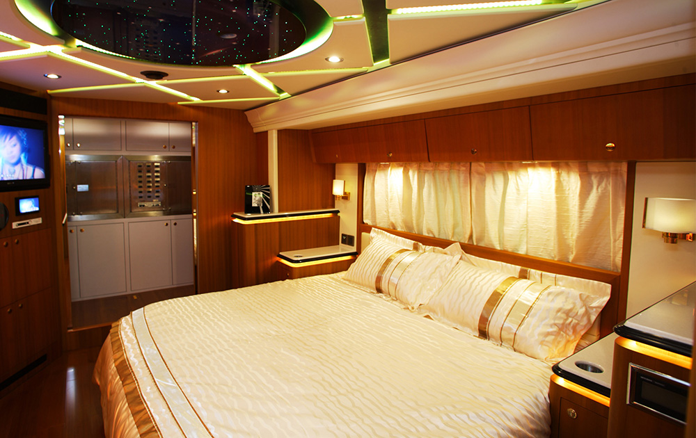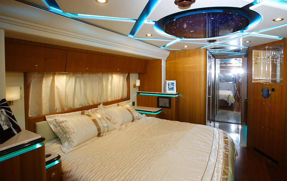 頂部紫紅色LED變色燈帶超大圓形星空頂窗超寬大雙人床兩側(cè)雙層級(jí)床頭柜組合柜內(nèi)嵌式組合音響