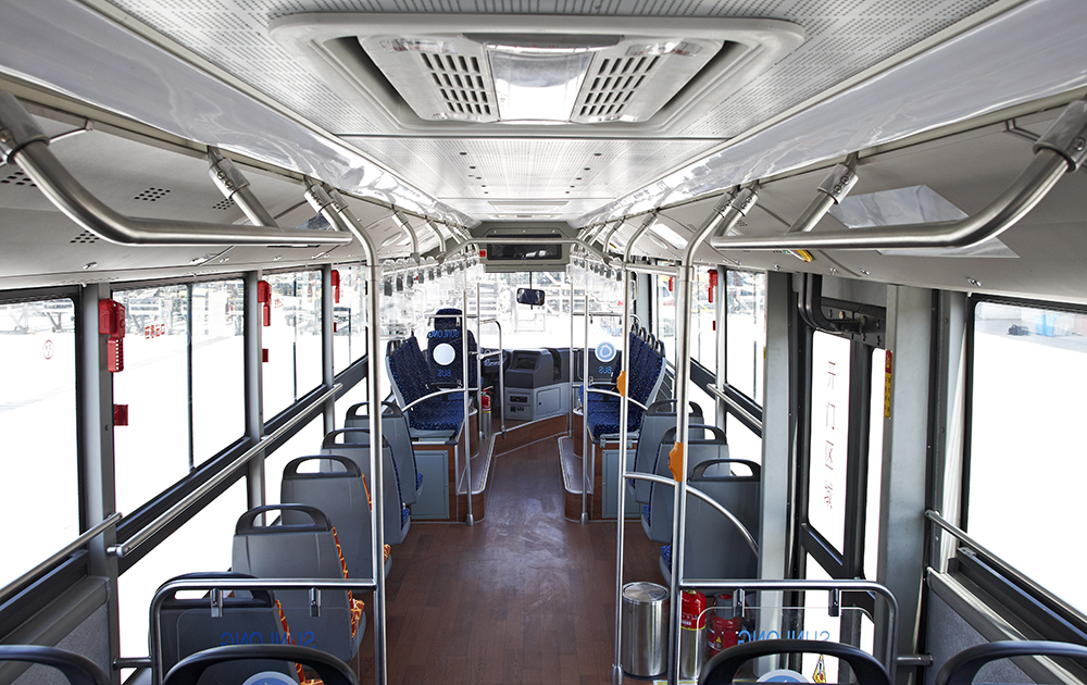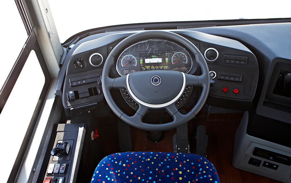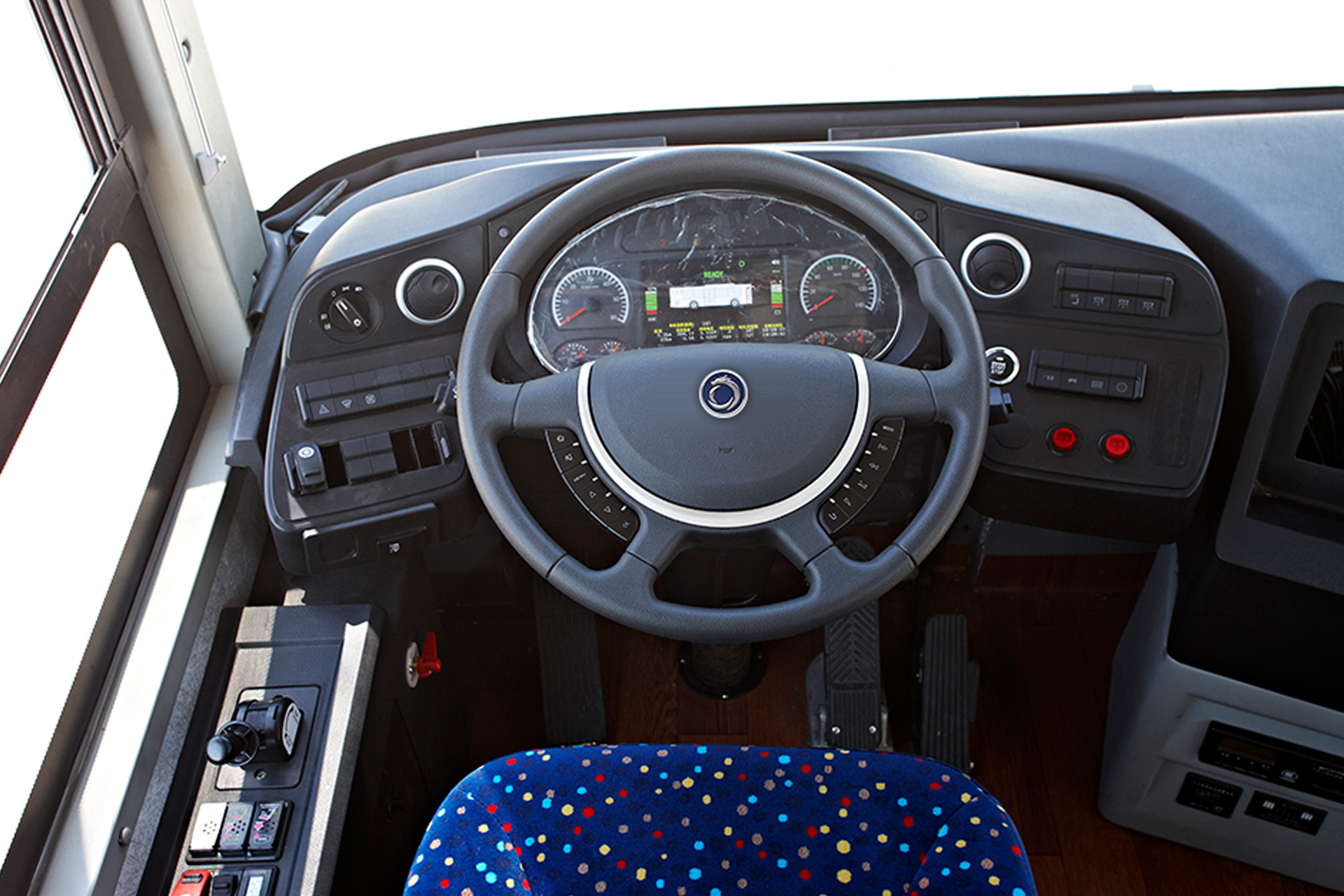 一體化儀表臺、全液晶儀表,駕駛區(qū)安裝氣囊減震座椅、小型智能嵌入式投幣機,一體式司機包圍結(jié)構(gòu),提高駕乘舒適性和安全性.