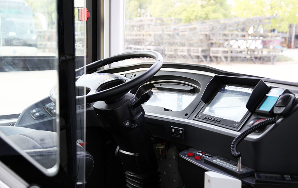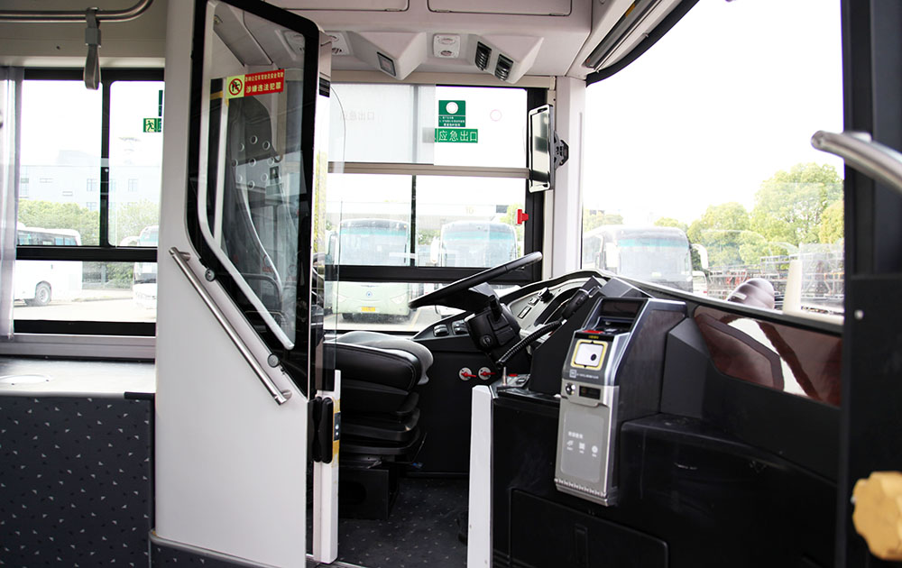 整車低地板設(shè)計(jì),配備ECAS懸架系統(tǒng),駕駛區(qū)安裝氣囊減震座椅、全液晶儀表,小型智能嵌入式投幣機(jī),一體式司機(jī)包圍結(jié)構(gòu),提高駕乘舒適性和安全性;